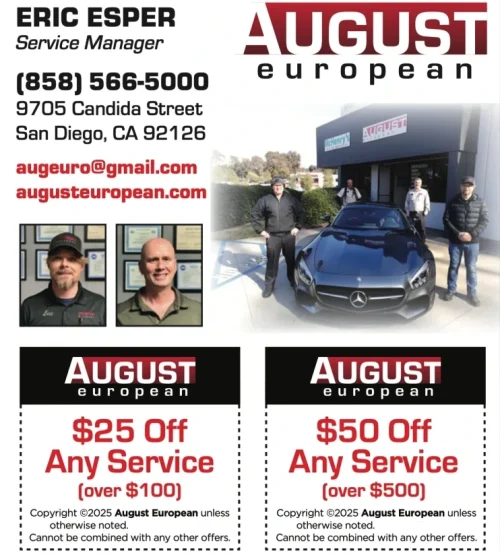 When you bring your European vehicle to August European, you’re choosing one of San Diego’s highest-rated shops for foreign and luxury car repair. Whether you’re dealing with performance issues, leaks, unusual smells, warning lights, or visible damage, our technicians have the technology and training to diagnose and fix the problem efficiently. Our commitment from the beginning has been to get the job done right the first time. We’ve upheld that promise for more than three decades. Contact us online or by phone today, and let’s get your European auto repair started.